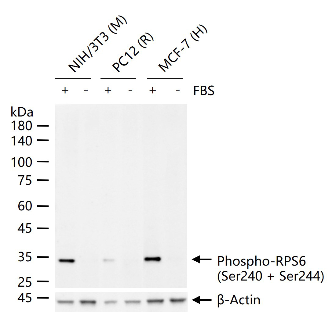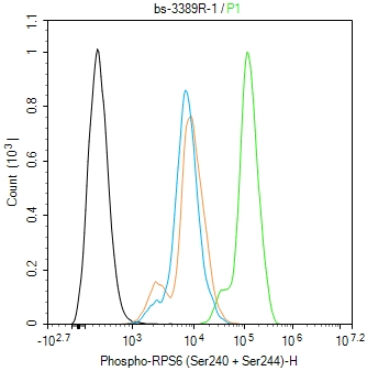 HepG2 cells were\u00a0fixed with 4% PFA for 10min at room temperature,permeabilized with\u00a090% ice-cold methanol for 20 min at -20\u2103,\u00a0and incubated in 5% BSA blocking buffer\u00a0for 30 min at room temperature. Cells were then stained with Phospho-RPS6 (Ser240 + Ser244) Antibody(bs-3389R)at 1:100 dilution\u00a0in blocking buffer and\u00a0incubated for 30 min at\u00a0room temperature,\u00a0washed twice with 2%BSA in PBS,\u00a0followed by\u00a0secondary antibody incubation\u00a0for 40 min\u00a0at\u00a0room temperature. Acquisitions of 20,000 events were performed.\u00a0Cells stained with primary antibody\u00a0(green), and isotype control (orange).