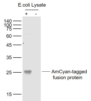 | AmCyan1 is a human codon-optimized variant of the wild-type Anemonia majano cyan fluorescent protein (AmCyan) that exhibits enhanced emission characteristics (excitation and emission maxima: 458nm and 489nm, respectively). DD-AmCyan1 is a modified version of AmCyan1 that is tagged on its N-terminus with the ProteoTuner destabilization domain (DD). The presence of this destabilization domain causes rapid, proteasomal degradation of the fluorescent fusion protein; however, when the membrane permeant ligand Shield1 is added to the medium, it binds to the destabilization domain and protects the fusion protein from degradation. |
