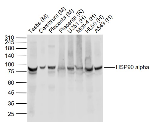 | Molecular chaperone that promotes the maturation, structural maintenance and proper regulation of specific target proteins involved for instance in cell cycle control and signal transduction. Undergoes a functional cycle that is linked to its ATPase activity which is essential for its chaperone activity. This cycle probably induces conformational changes in the client proteins, thereby causing their activation. Interacts dynamically with various co-chaperones that modulate its substrate recognition, ATPase cycle and chaperone function (PubMed:11274138, PubMed:15577939, PubMed:15937123, PubMed:27353360). Engages with a range of client protein classes via its interaction with various co-chaperone proteins or complexes, that act as adapters, simultaneously able to interact with the specific client and the central chaperone itself. Recruitment of ATP and co-chaperone followed by client protein forms a functional chaperone. After the completion of the chaperoning process, properly folded client protein and co-chaperone leave HSP90 in an ADP-bound partially open conformation and finally, ADP is released from HSP90 which acquires an open conformation for the next cycle (PubMed:27295069, PubMed:26991466). Apart from its chaperone activity, it also plays a role in the regulation of the transcription machinery. HSP90 and its co-chaperones modulate transcription at least at three different levels. In the first place, they alter the steady-state levels of certain transcription factors in response to various physiological cues. Second, they modulate the activity of certain epigenetic modifiers, such as histone deacetylases or DNA methyl transferases, and thereby respond to the change in the environment. Third, they participate in the eviction of histones from the promoter region of certain genes and thereby turn on gene expression (PubMed:25973397). Binds bacterial lipopolysaccharide (LPS) and mediates LPS-induced inflammatory response, including TNF secretion by monocytes (PubMed:11276205). Antagonizes STUB1-mediated inhibition of TGF-beta signaling via inhibition of STUB1-mediated SMAD3 ubiquitination and degradation (PubMed:24613385). |