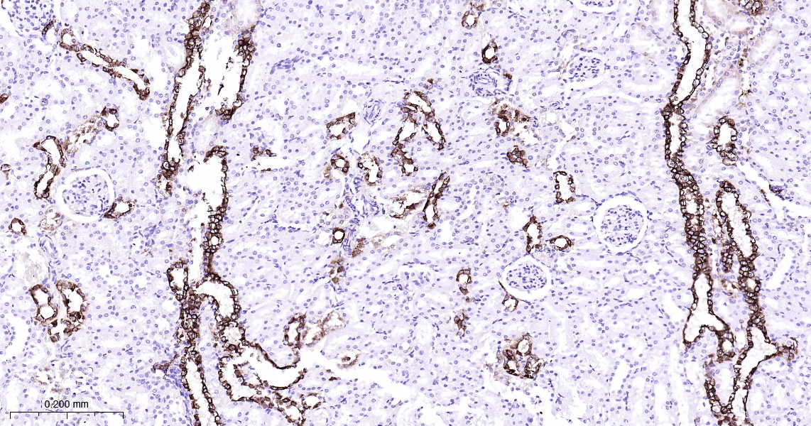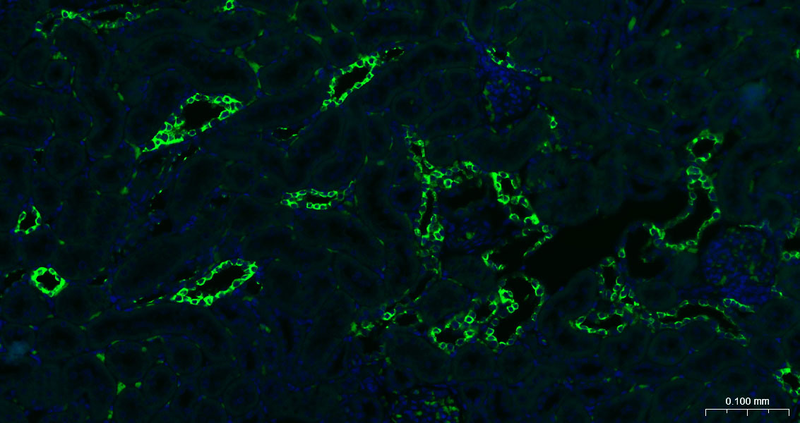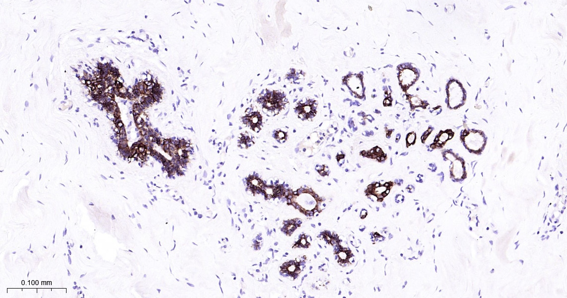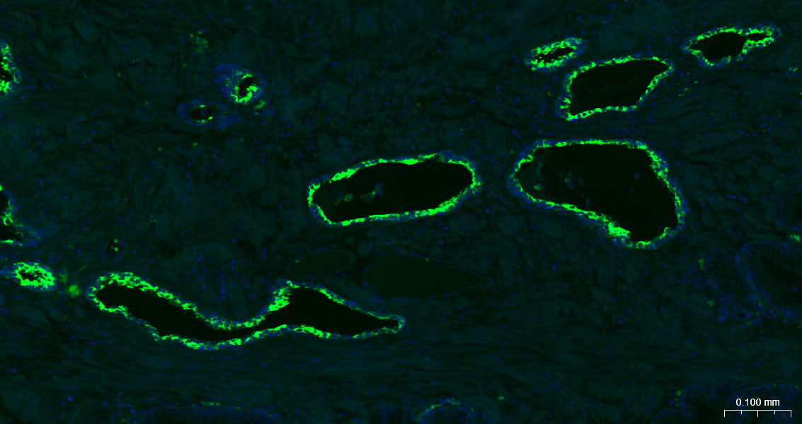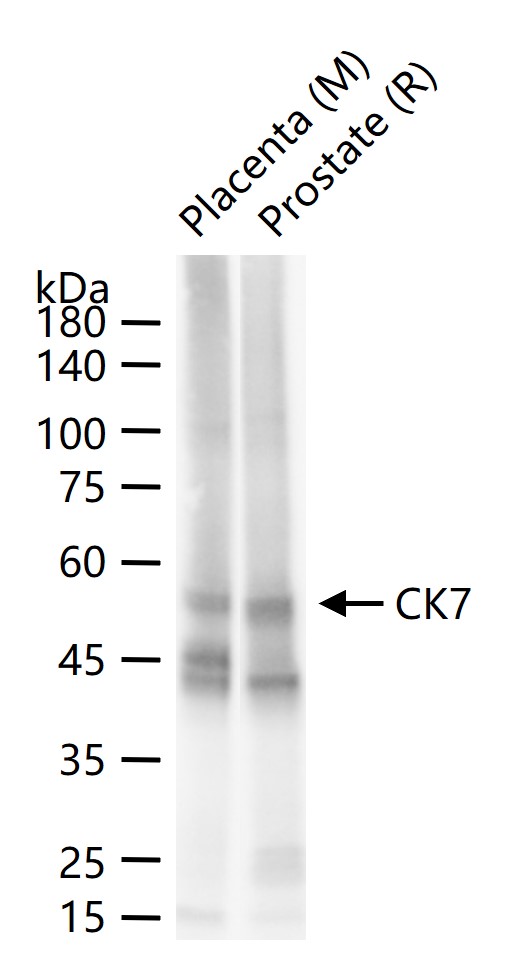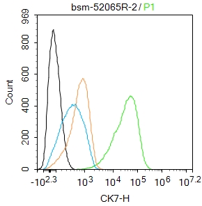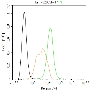 Hela cells were fixed with 4% PFA for 10min at room temperature,permeabilized with 90% ice-cold methanol for 20 min at -20\u2103, and incubated in 5% BSA blocking buffer for 30 min at room temperature. Cells were then stained with Cytokeratin 7 (6E6) Monoclonal Antibody(bsm-52065R)at 1:100 dilution in blocking buffer and incubated for 30 min at room temperature, washed twice with 2%BSA in PBS, followed by secondary antibody incubation for 40 min at room temperature. Acquisitions of 20,000 events were performed. Cells stained with primary antibody (green), and isotype control (orange).