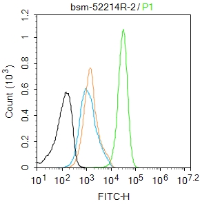 MCF7 cells(black) were fixed with 4% PFA for 10min at room temperature,permeabilized with 90% ice-cold methanol for 20 min at -20\u2103, and incubated in 5% BSA blocking buffer for 30 min at room temperature. Cells were then stained with YAP1 (S127) (1H12) Monoclonal Antibody(bsm-52214R)at 1:50 dilution in blocking buffer and incubated for 30 min at room temperature, washed twice with 2%BSA in PBS, followed by secondary antibody(blue) incubation for 40 min at room temperature. Acquisitions of 20,000 events were performed. Cells stained with primary antibody (green), and isotype control (orange).