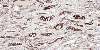 Immunohistochemical analysis of paraffin embedded human kidney tissue slide using IHC0305H (Human FDPS Kit).